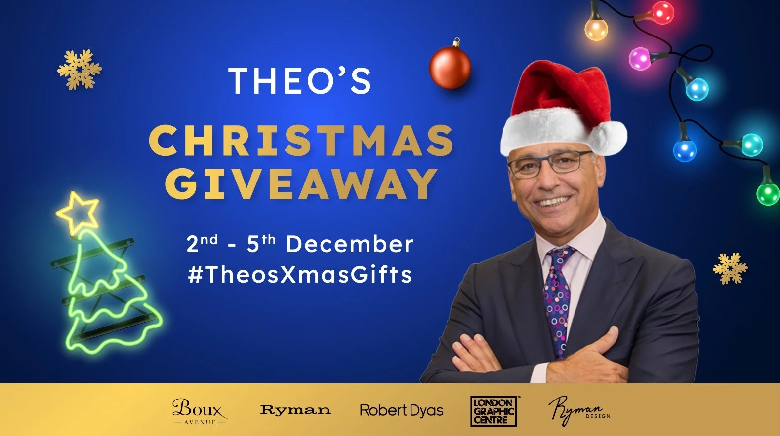 Entrants must like the prize draw post and comment #TheosXmasGifts under the relevant post on Theo Paphitis’s Instagram page (@theopaphitis);